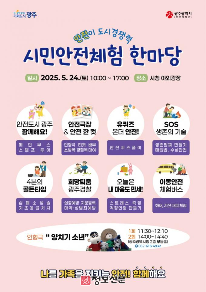 광주시 이부호 안전정책관은 “안전체험 한마당은 다양한 체험과 공연을 통해 시민들이 안전에 대해 보다 쉽고 재미있게 다가갈 수 있도록 기획했다”며 “시민 모두가 안전수칙을 실천해 ‘나와 가족, 그리고 광주를 지키는 안전도시’에 함께하길 바란다”고 말했다.