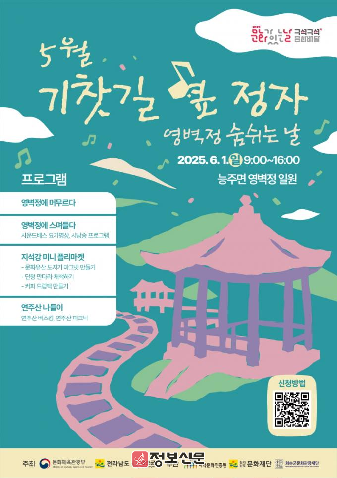 이어 6월 1일(일)에는 오전 9시부터 오후 4시까지 능주면 영벽정 유원지 일대에서 ‘기찻길 옆 정자; 영벽정 숨 쉬는 날’이 열린다. 정자와 자연이 어우러진 공간에서 진행되는 이 행사는 휴식과 치유, 감성이 공존하는 특별한 하루를 제공한다.