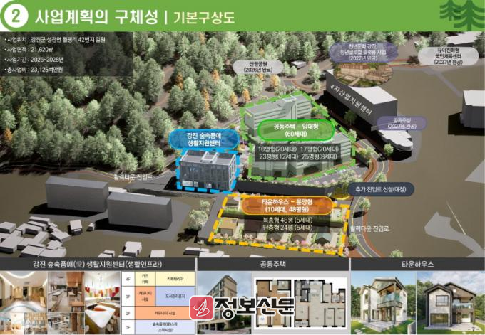 강진군의 ‘숲속품애 마을’ 조성 사업은 폐교된 성화대학 부지(2만1천620㎡)에 70세대(공동주택 60세대·타운하우스 10세대)의 주거단지와 키즈카페, 도서관 라운지, 커뮤니티시설, 스파 등 복합 타운을 조성할 계획이다. 2028년까지 4년간 231억 원(국비 132억 원)이 투입될 예정이다.