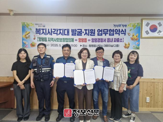 함평군은 22일 “함평읍과 함평경찰서 읍내파출소(소장 정제명), 함평읍 지역사회보장협의체(민간위원장 김행구)가 지난 20일 복지사각지대 발굴 및 지원 강화를 위해 업무협약을 체결했다”고 밝혔다.