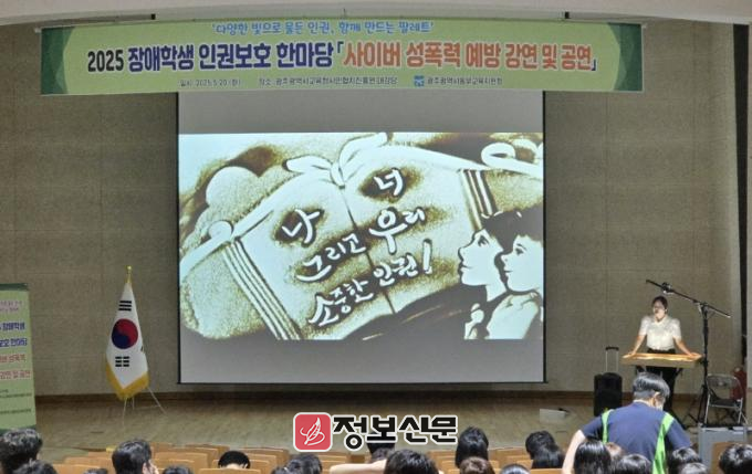 광주동부교육지원청은 20일 광주광역시교육시민협치진흥원 대강당에서 관내 중·고등학교 특수교육대상학생 및 교직원 196명을 대상으로 ‘사이버성폭력 예방 강연 및 공연’을 개최했다.