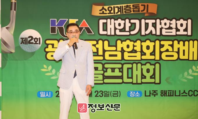 ![]() ▲(사)대한기자협회 광주·전남협회가 주최한 제2회 대한기자협회 광주·전남협회장배 골프대회에서 정승현 협회장이 대회사를 하고 있다. |