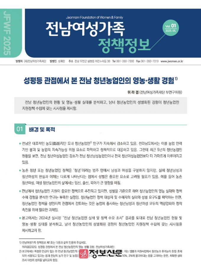 ![]() 전남여성가족재단, 전남 청년농업인의 영농‧생활 경험 정책정보 발간 |