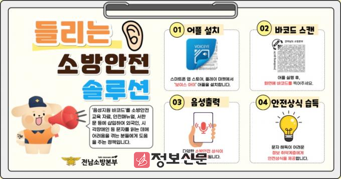 ‘들리는 소방안전 솔루션’은 우리말에 익숙하지 않은 외국인과 정보 접근이 어려운 장애인의 위기 대응 능력 향상을 목표로 추진된 사업으로, 스마트폰 애플리케이션 ‘보이스아이(VoiceEye)’를 활용한 음성 및 다국어 정보 제공 방식이 특징이다.