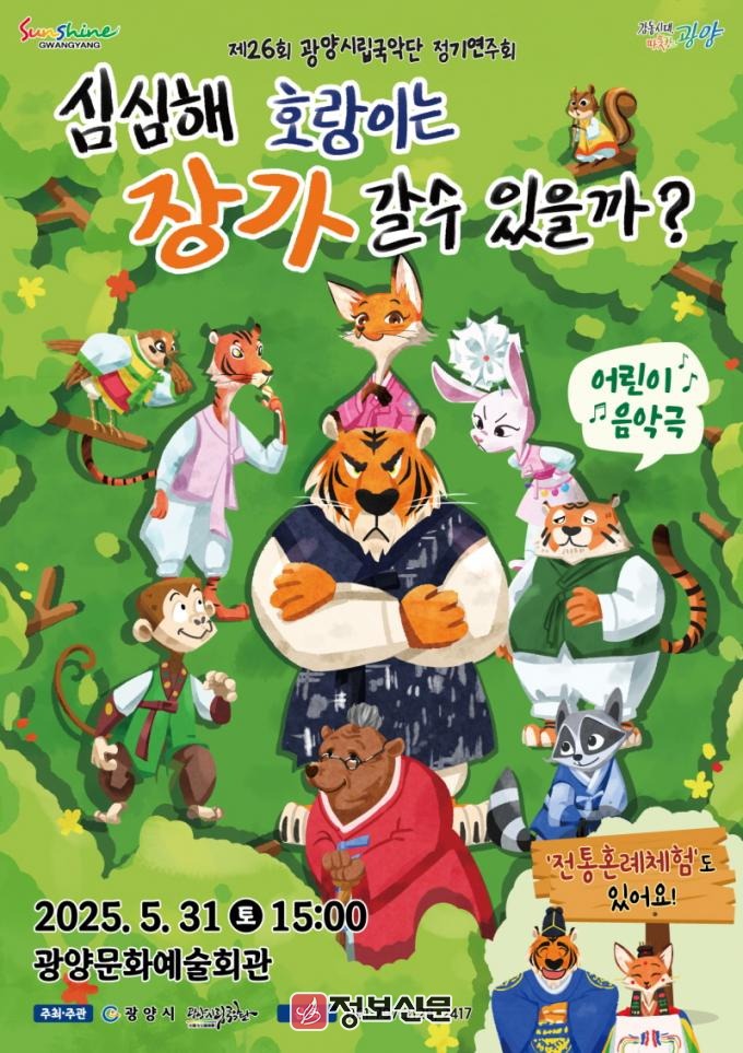 김명덕 문화예술과장은 “시립국악단에서 평소 접하기 힘든 국악을 소재로 한 어린이 음악극을 선보이는 만큼 어린이 가정의 많은 관심을 부탁드린다.”고 전했다.
