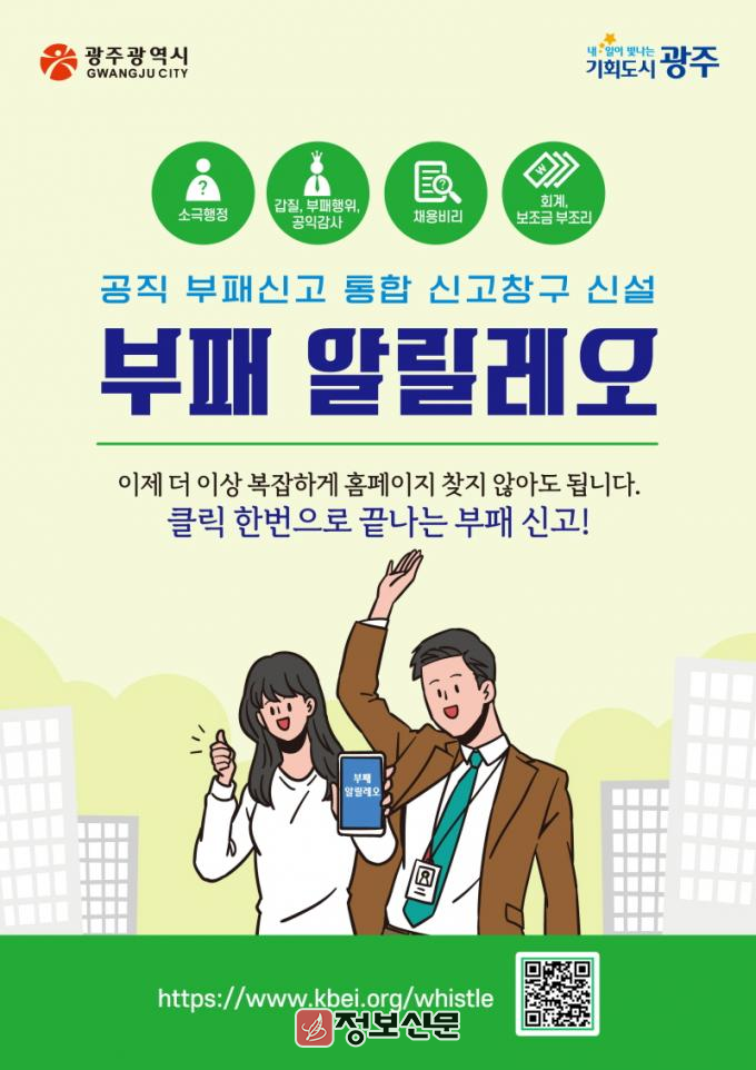 ![]() 광주광역시, 부패신고 통합시스템 ‘부패 알릴레오’ 구축 본격 운영 |
