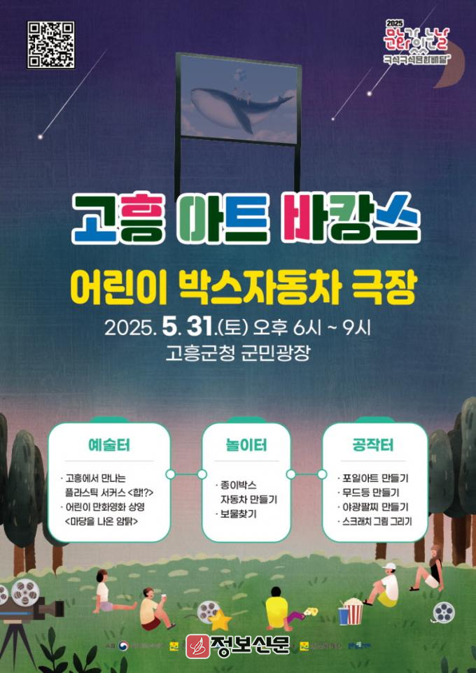 또한, 이날 행사의 하이라이트로는 참가 어린이들이 직접 만든 자신만의 박스자동차에서 인기 애니메이션 영화 <마당을 나온 암탉>을 관람하는 특별한 시간이 마련된다. 고흥군 관계자는 “이번 행사를 통해 고흥 군민들이 가족과 함께 문화예술을 즐기며 행복한 추억을 만드는 시간이 되길 바란다”고 전했다.