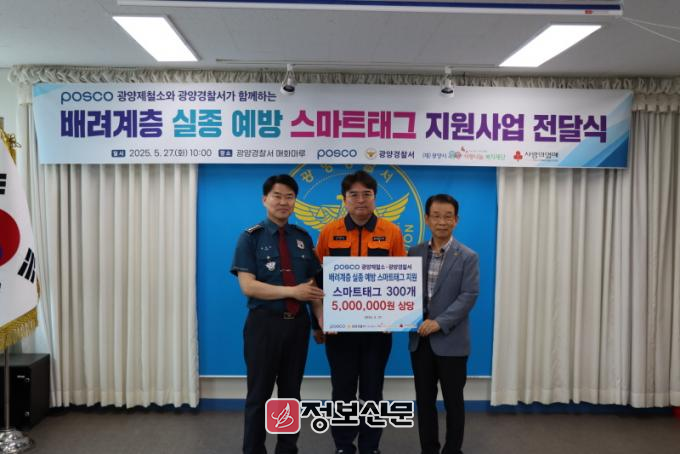 이날 전달된 스마트태그는 포스코광양제철소에서 후원한 총 5,000,000원의 사업비로 광양시사랑나눔복지재단에서 스마트태그 기기 300개를 구매하여 향후 광양경찰서에서 관내 치매 노인 중 실종 위험 및 실종 경험이 있는 300명의 대상자에게 스마트태그를 순차적으로 우선 배부하여 치매 노인 실종 발생시 신속한 발견 및 예방에 활용 예정이다.