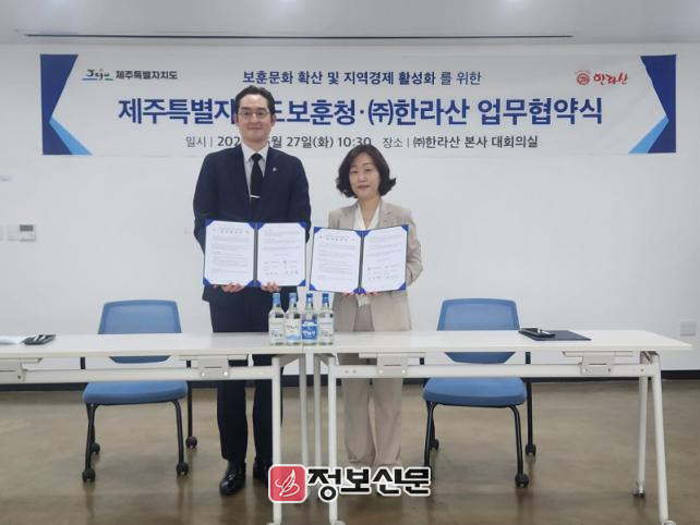 제주도 보훈청과 ㈜한라산은 27일 오전 제주시 한림읍 ㈜한라산 본사에서 보훈문화 확산과 지역경제 활성화를 위한 상호협력 업무협약을 체결했다.