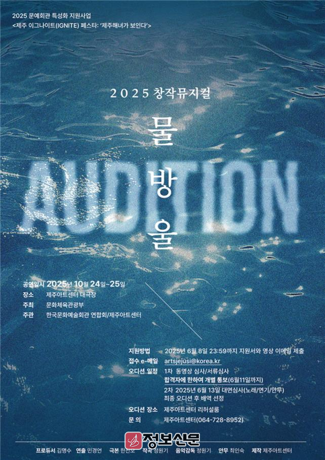 ![]() 제주아트센터, 창작뮤지컬 ‘물방울’ 주·조역 오디션 개최 |
