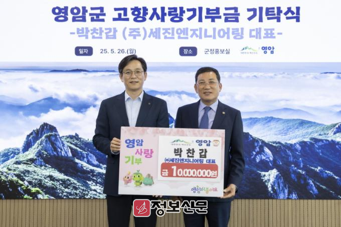 ![]() 영암군, 지역 기업 고향사랑기부 행렬 줄이어(박찬갑 세진엔지니어링 대표 영암군 고향사랑기부) |