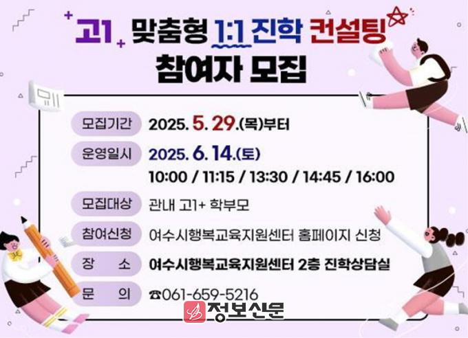 ![]() 여수시, 고1을 위한 ‘맞춤형 1:1 진학 컨설팅’ 참여자 모집 |