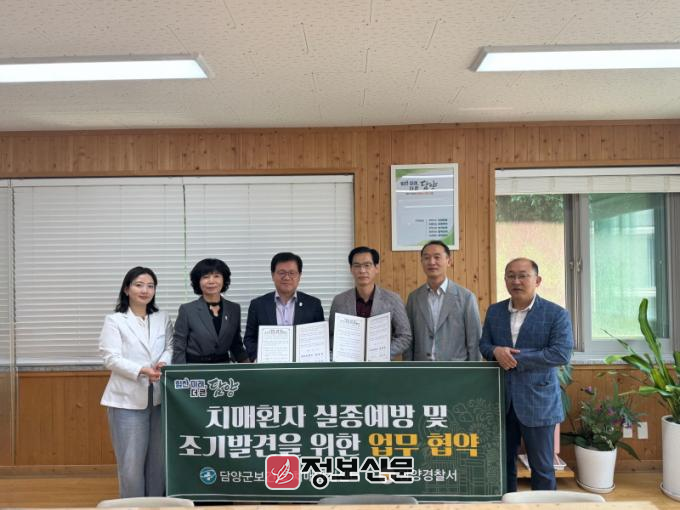 담양군은 5월 27일 보건소 2층 소장실에서 담양경찰서(수사과장 안경수)와 함께 ‘치매환자 실종 예방 및 조기 발견을 위한 업무협약’을 체결했다.