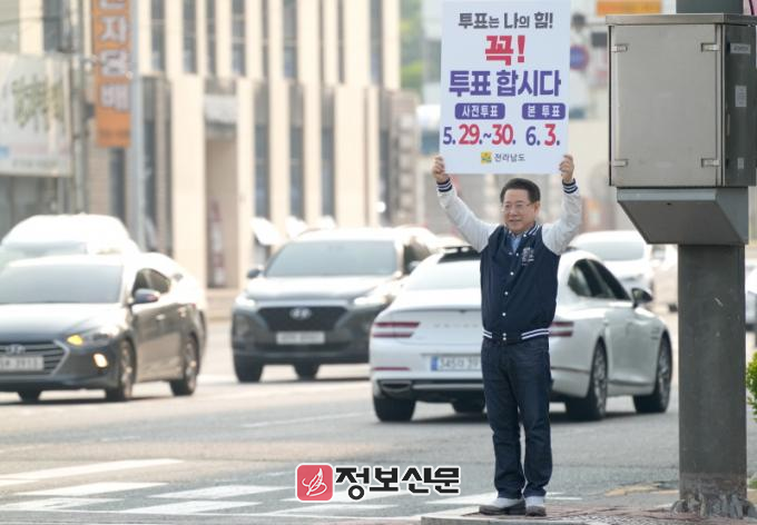 김영록 전남도지사는 28일 오전 8시부터 9시까지 순천 조례사거리에서 ‘투표는 나의 힘! 꼭 투표합시다!’라는 내용이 담긴 피켓을 들고 도민들이 투표에 적극 참여할 것을 호소했다.