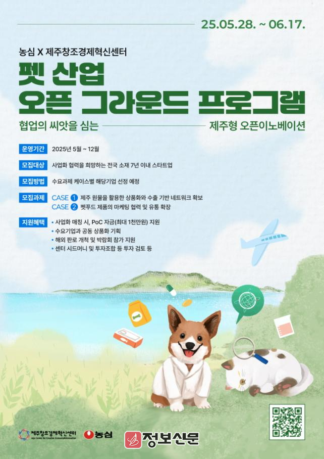 ![]() 제주창조경제혁신센터, 농심과 함께 ‘펫 산업 오픈 그라운드 프로그램’ 참가 스타트업 모집 |