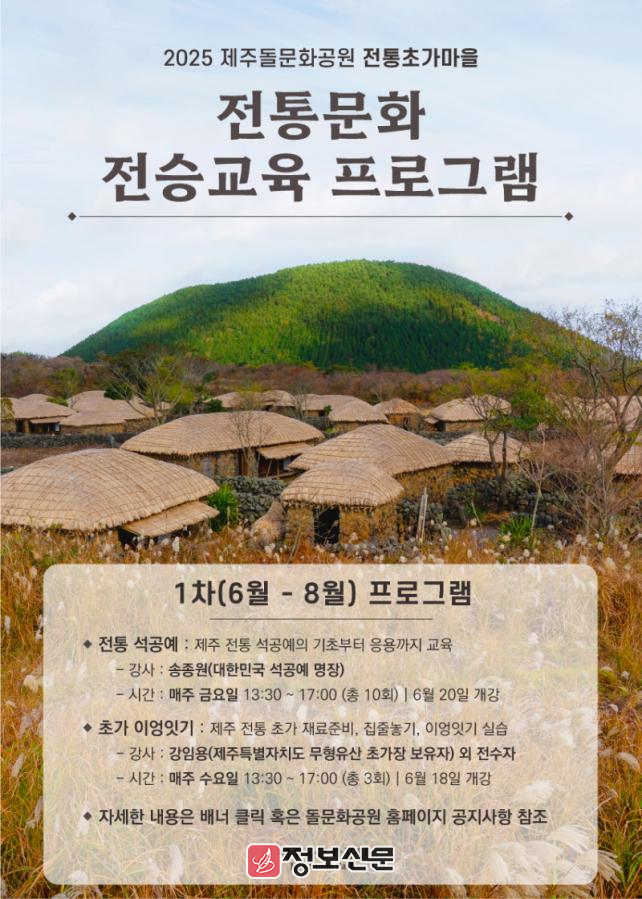 돌문화공원관리소 관계자는 “이번 프로그램은 단순한 체험을 넘어 제주의 소중한 전통 문화유산의 의미와 가치를 되새기고, 미래까지 전승될 수 있는 초석을 마련하기 위해 준비된 만큼, 전통초가마을에서 명장들과 함께 할 수 있는 프로그램에 많은 참여와 호응을 부탁드린다.”라고 전했다.