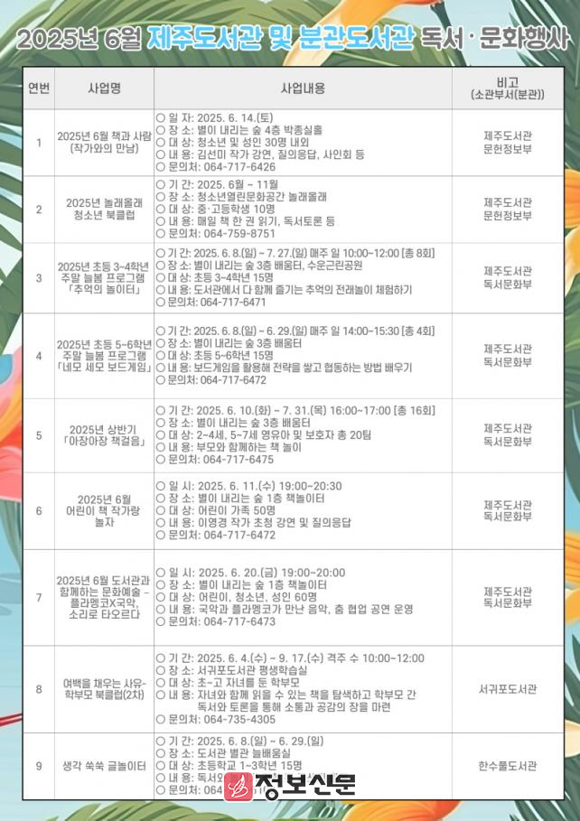 ![]() 제주도서관, 6월 지역주민을 위한 다채로운 독서 문화 프로그램 운영 |
