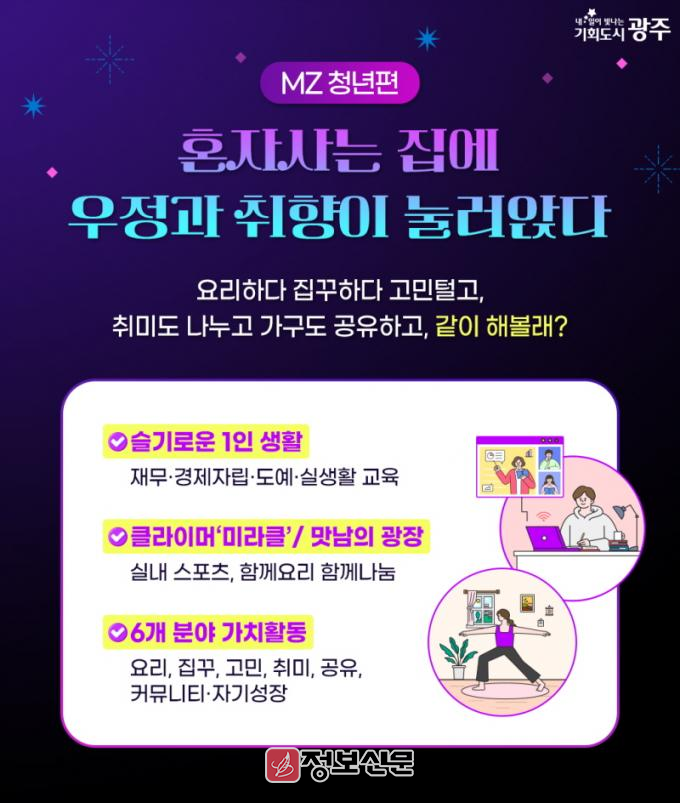 청년 1인가구는 사회관계망 형성 중심으로 한 사업을 추진하며 ▲슬기로운 1인생활(재무·경제 교육) ▲미라클(실내스포츠) ▲맛남의광장(함께요리) ▲6개분야 가치활동(요리‧집꾸미기‧고민‧취미‧공유‧자기성장) 등을 추진한다.