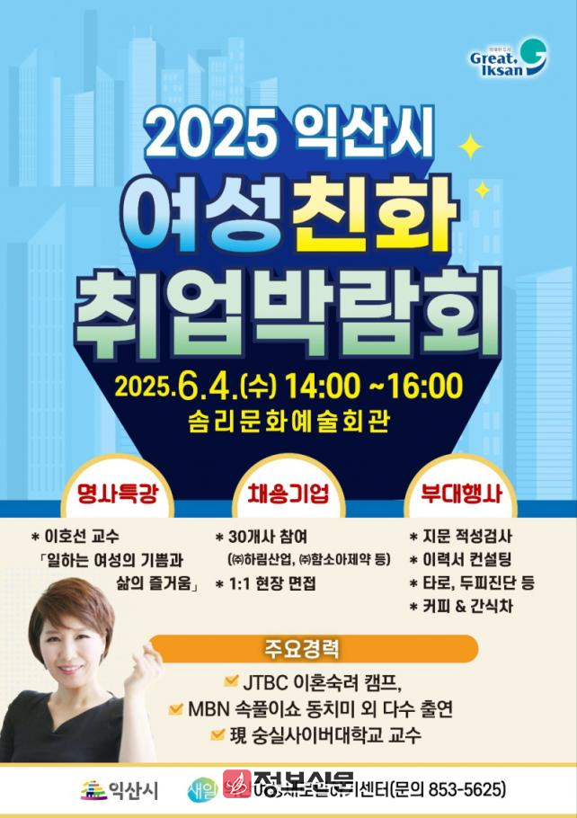 익산시는 익산여성새로일하기센터(이하 익산새일센터, 센터장 장정남)가 '2025 여성친화 취업박람회'를 오는 6월 4일 오후 2~4시 솜리문화예술회관에서 개최한다고 29일 밝혔다.