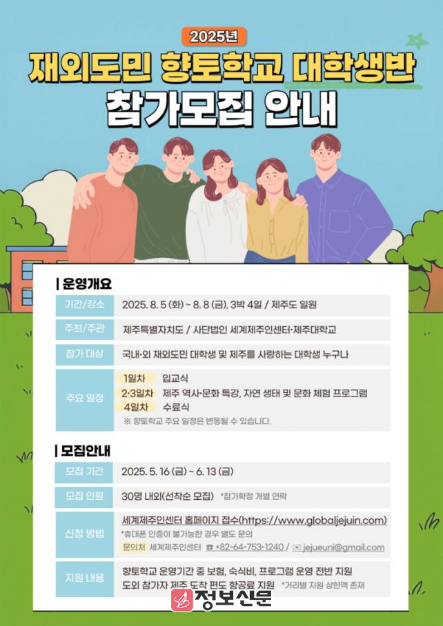 ![]() 제주특별자치도, 2025년 향토학교 대학생반 참가자 모집 |