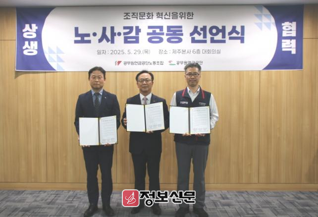 이번 선언식은 공단의 지속가능한 발전과 신뢰받는 조직 구현을 위해 노사 및 감사가 함께 뜻을 모은 자리로, 노·사·감 대표는 ▲적극적인 내부통제를 통한 청렴 실천 및 부패 방지 ▲직장 내 괴롭힘, 차별 등의 인권 침해 예방 ▲안전하고 건강한 근무환경 조성 ▲불필요한 절차 및 관행 개선을 통한 스마트한 조직문화 구축 ▲역할과 기여도가 공정하게 반영되는 인사조직 운영에 대한 공동 실천을 다짐했다.