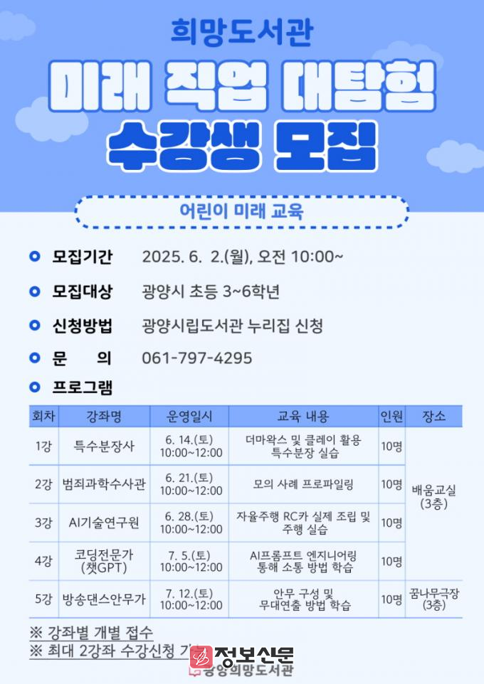 ![]() 광양희망도서관, ‘미래 직업 대탐험’ 프로그램 수강생 모집 |