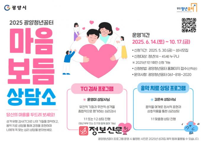 ‘마음보듬 상담소’는 오는 6월 14일부터 10월 17일까지 운영되며, TCI 심리검사 상담과 음악 치료 상담 두 가지 프로그램으로 구성됐다. 모집인원은 각각 30명과 10명이며, 광양시에 거주하거나 활동하는 청년이면 누구나 신청할 수 있다.