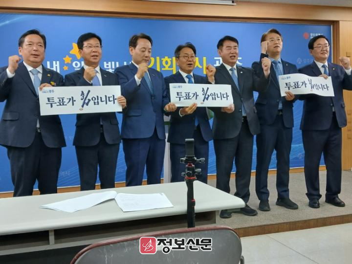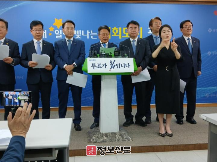 2일 시청 브리핑룸에서 진행된 이날 공동 기자회견은 강기정 광주시장을 비롯해 이정선 광주시교육감, 임택 동구청장, 김이강 서구청장, 김병내 남구청장, 문인 북구청장, 박병규 광산구청장이 참석했다.