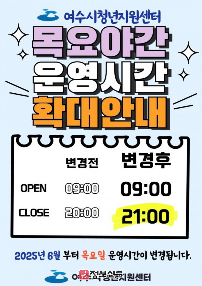 ![]() 여수시 청년지원센터, ‘목요 야간 운영’ 오후 9시까지 확대 |