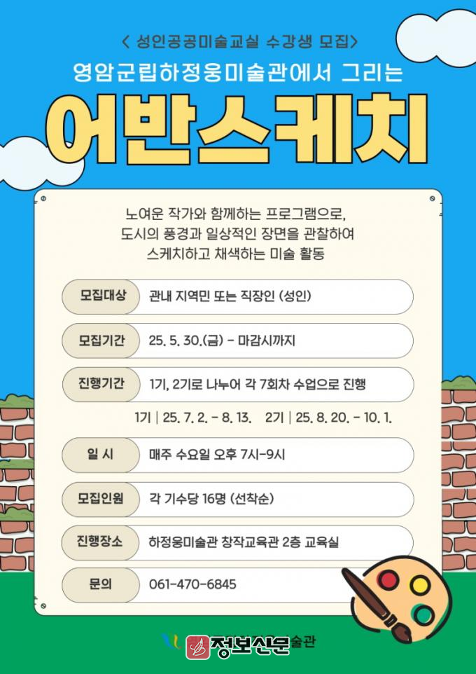 모집 인원은 기수별 16명씩 총 32명이며, 영암군에 거주하는 성인 누구나 선착순으로 참여할 수 있다. 교육 참여 희망자는 영암군립하정웅미술관에 방문·이메일로 신청할 수 있으며, 자세한 내용은 미술관 홈페이지에서 볼 수 있다. .