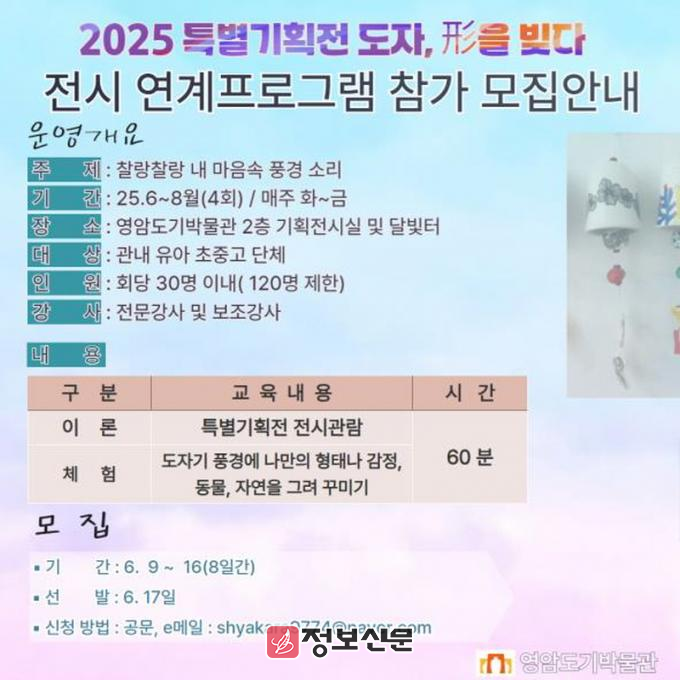 ![]() 영암도기박물관, 유아~고교생 참여 문화체험 프로그램 참가 단체 모집 |