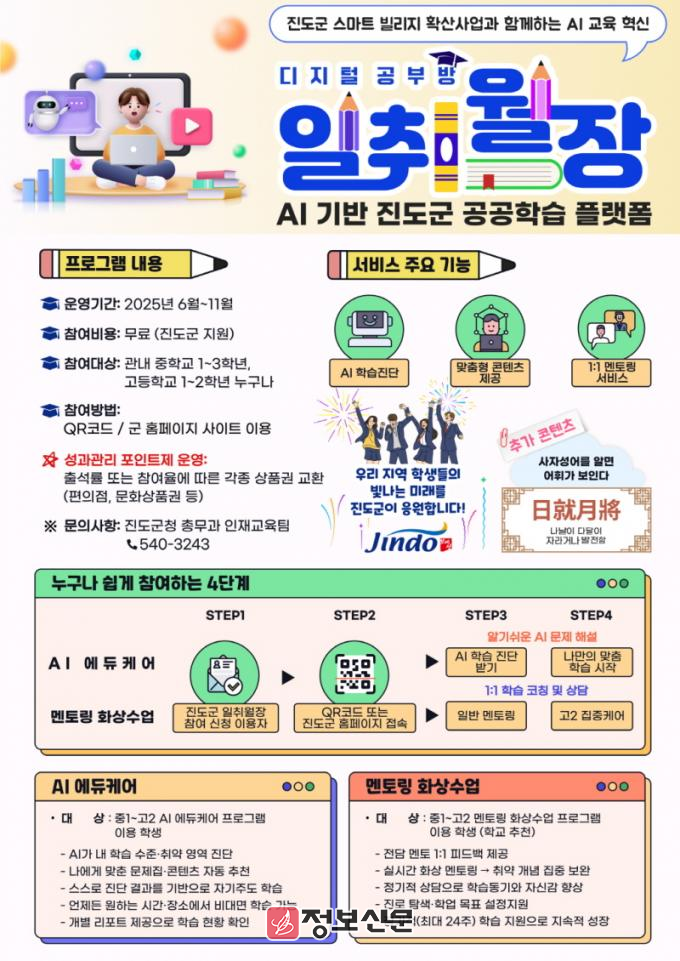 ![]() 진도군, 공공학습 플랫폼 ‘일취월장’ 디지털공부방 6월부터 도입 운영 |