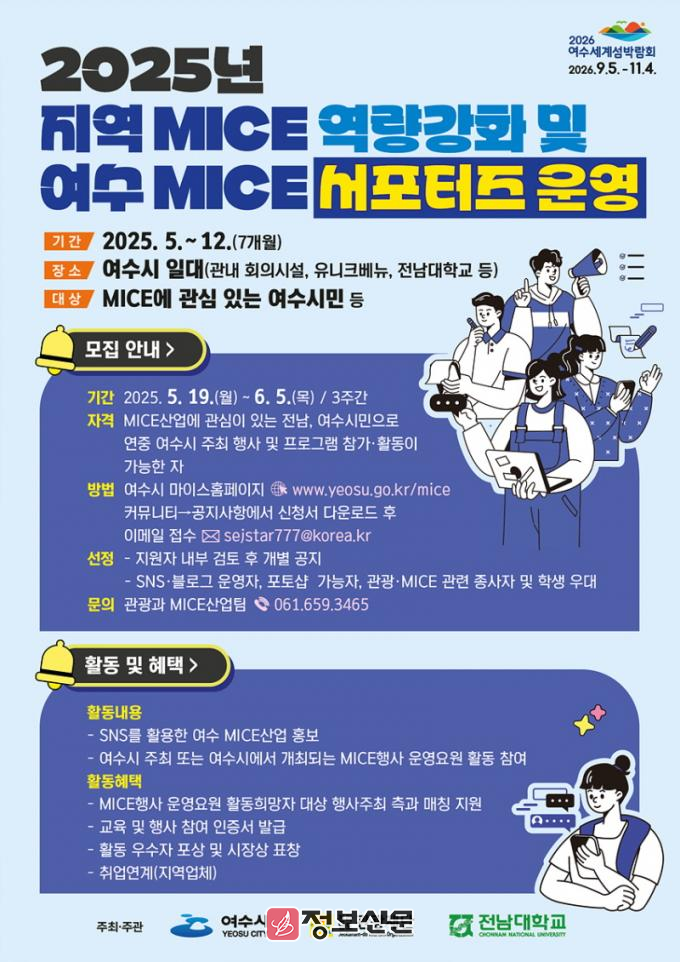 교육은 오는 9일부터 진행되며, 서포터즈 참여를 희망하는 시민은 여수시 마이스산업 누리집(www.yeosu.go.kr/mice) 공지사항에서 신청서를 내려받아 작성한 후 전자우편으로 제출하면 된다.