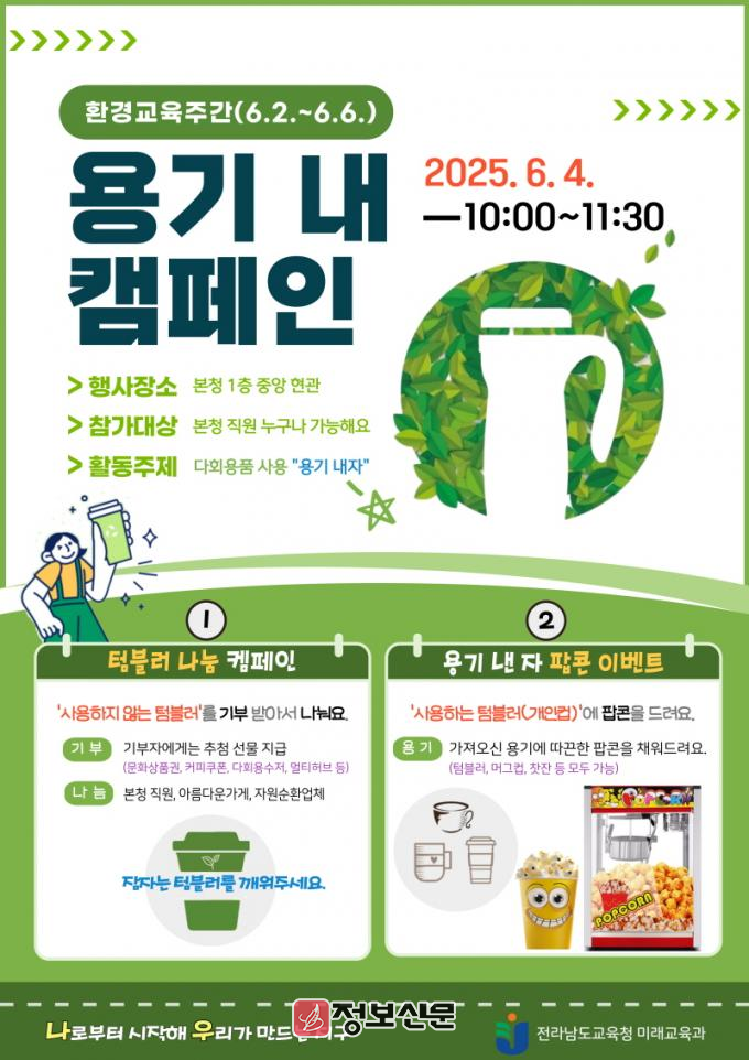 ![]() 전라남도교육청, 환경교육주간 맞아 ‘용기 내 캠페인’ 전개 |