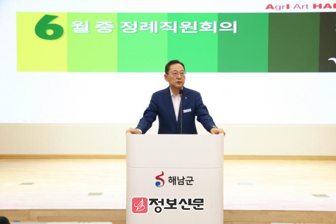 명현관 군수는 4일 직원 정례회의를 통해“지난해 계엄선포에서부터 대통령 탄핵 등 비상상황에서 치러진 조기대선이지만 빈틈없이 선거가 진행될 수 있도록 착실히 준비한 결과 높은 투표율로 선거를 잘 마무리하게 됐다”며“직전 대선에서 도내 16위라는 투표율이 이번 선거에서는 3위까지 상승할 수 있었던 데는 군민들과 공직자들이 합심해 선거를 통해 해남발전의 계기를 만들어보자는 의지가 통했기 때문”이라고 강조했다.