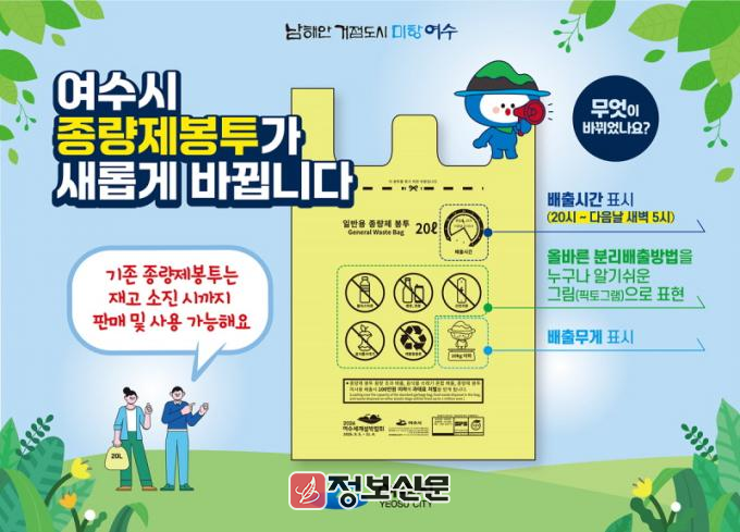 종량제 봉투에는 생활폐기물 수거 시간에 맞춰 배출할 수 있도록 배출 시간을 추가했으며, 환경미화원 등 취급자의 안전을 위해 무게 제한도 명시했다. 또, 정부 승인을 받은 국제행사인 2026여수세계섬박람회 엠블럼을 표기해 홍보 효과를 더했다.