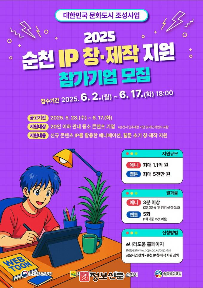 한편, ‘순천 IP 창·제작 지원 사업’은 대한민국 문화도시 조성사업의 일환으로 순천시와 (재)순천문화재단이 공동 추진하며, 자세한 내용은 순천문화재단 누리집 또는 e나라도움 공모사업목록에서 확인할 수 있다.