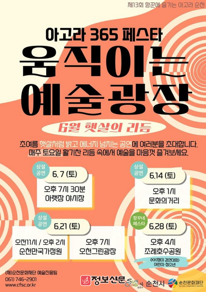 ![]() 순천문화재단, 2025 항꾼에 즐기는 아고라 순천 6월 상설공연 순천 곳곳 찾아가 |