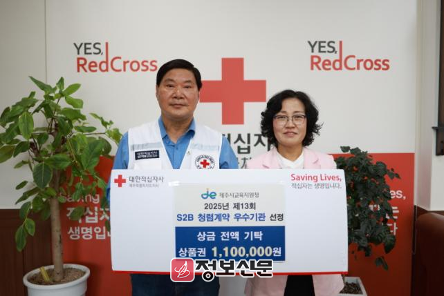 제주시교육지원청은 3년 연속 청렴계약 우수기관으로 선정되며 받은 시상금을 매년 지역사회에 기탁해 왔으며 올해도 시상금 110만 원(상품권) 전액을 지난 4일 대한적십자사 제주특별자치도지사(회장 정태근)에 기탁하였다.