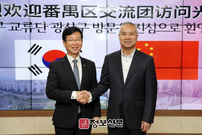 ![]() 박병규 광산구청장(왼쪽)이 당력명 판위구 상무위원(오른쪽)과 환담 후 기념 촬영을 하고 있다. |