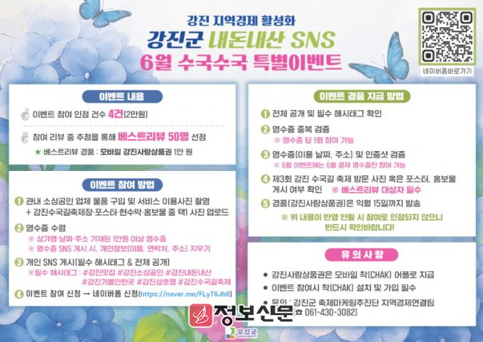 ![]() 강진군, 6월 ‘내돈내산 SNS’ 특별이벤트 진행 |