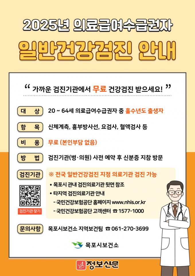 ![]() 목포시, 의료급여수급권자 무료 일반건강검진 지원사업 추진 |