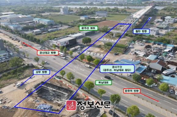 이번 부분 교통통제를 실시하는 하남대로 구간은 철도 광주선과 하남대로를 횡단하는 코스로 총 연장 880m, 폭 21m 규모의 영산강대교(가칭)를 신설하는 공사가 진행된다.