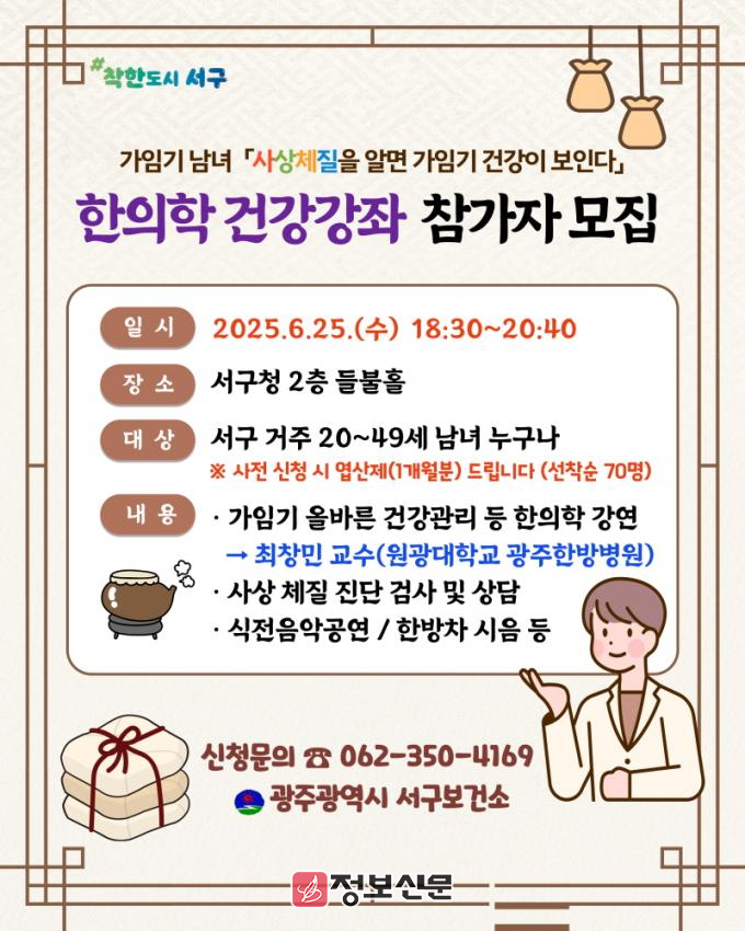 ![]() 광주시 서구, 한의학 건강 강좌 사상체질을 알면 가임기 건강이 보인다 진행 |