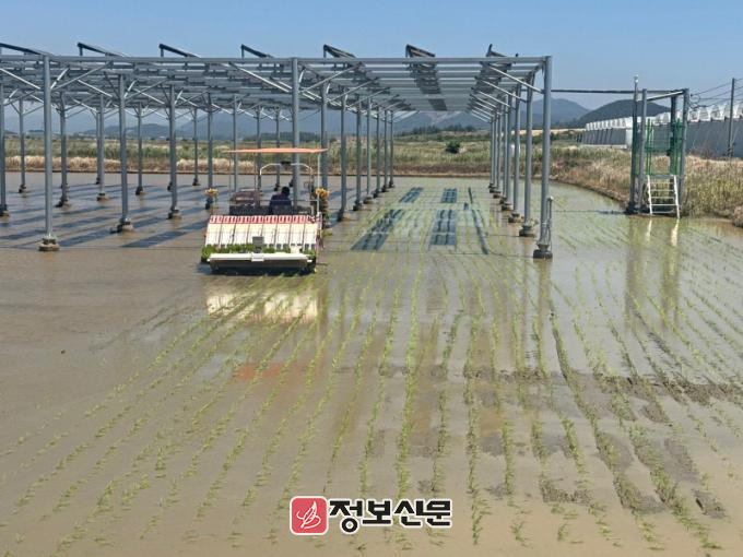 군은 산이면 간척 내 벼 재배지 3,000㎡ 부지에 1,000㎡ 면적의 영농형태양광 시설을 설치하고, 지난주 모내기 작업을 마쳤다.