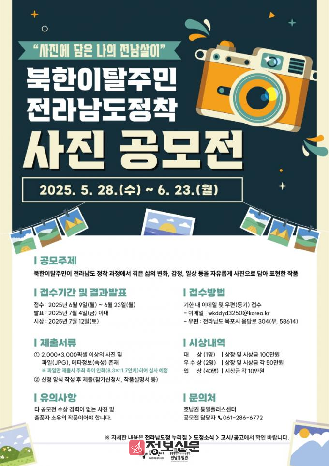 김진선 통일플러스센터장은 “이번 공모전을 통해 북한이탈주민의 삶과 정착 이야기가 도민과 자연스럽게 공유되길 바란다”며 “전남에 거주하는 북한이탈주민이 적극적으로 사회에 참여하는 계기가 되길 기대한다”고 말했다.