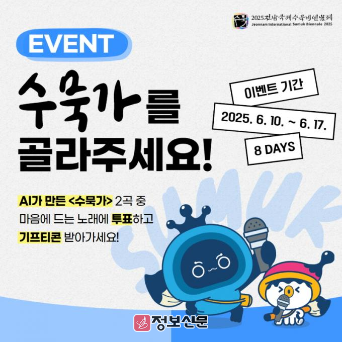 이벤트 참여를 바라는 국민은 전남국제수묵비엔날레 공식 유튜브 채널을 구독한 뒤, 인공지능이 제작한 ‘수묵가’의 밴드 버전과 발라드 버전 두 곡을 모두 감상하고, 이벤트 페이지(https://naver.me/F5aQ2mZO)에서 마음에 드는 버전에 투표하면 된다.