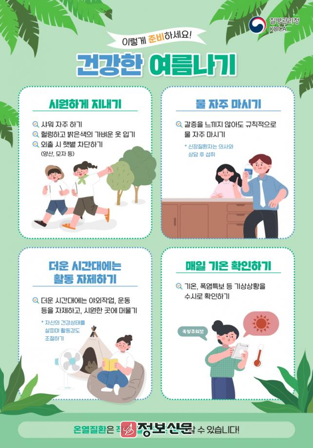 보건소는 폭염 대응 행동요령으로 △샤워 자주 하기 △헐렁하고 밝은색의 가벼운 옷 입기 △외출 시 햇볕 차단하기(양산, 모자 등 활용) △물 자주 마시기 △더운 시간대(오후 12시~5시) 야외활동 자제하기 △매일 기상상황(폭염특보 등) 수시 확인하기 등을 소개했다.