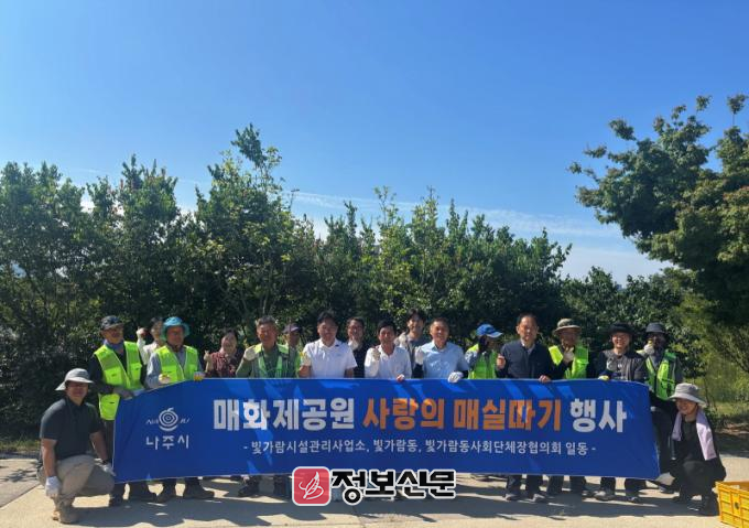 이날 매실 수확에는 빛가람시설관리사업소와 빛가람행정복지센터, 빛가람동 사회단체협의회 등 20여명이 참여해 정성껏 열매를 거뒀고 수확한 매실은 전량 사회복지법인 금성원에 기탁했다.