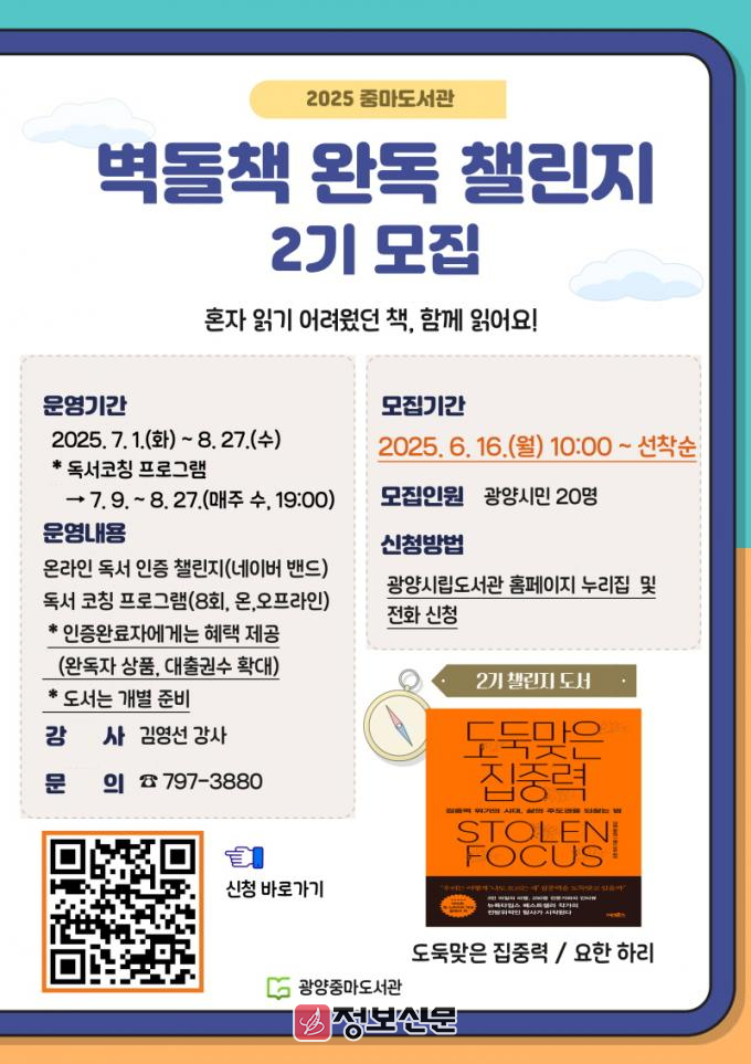 ![]() 광양중마도서관, 「벽돌책 완독 챌린지」 2기 운영 |